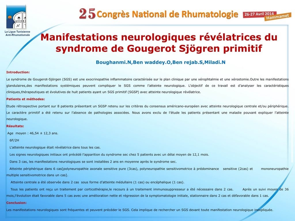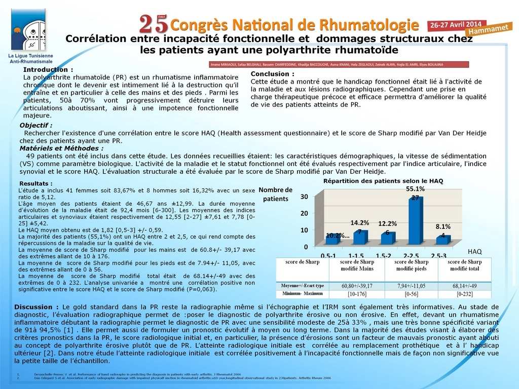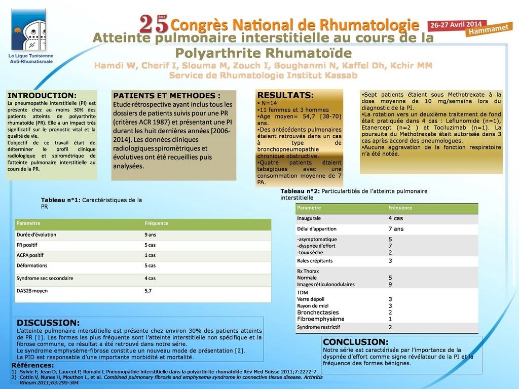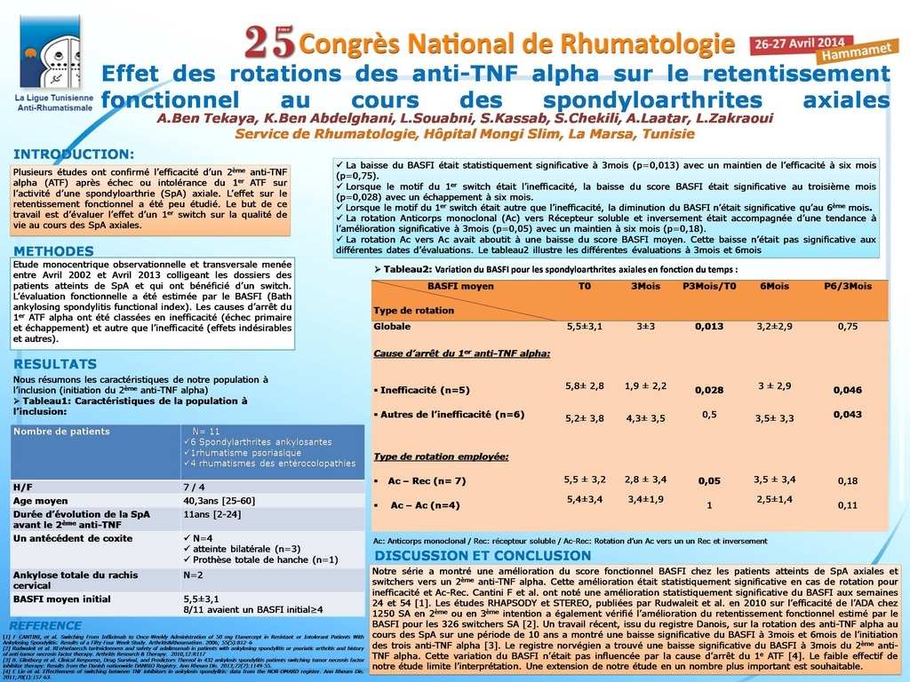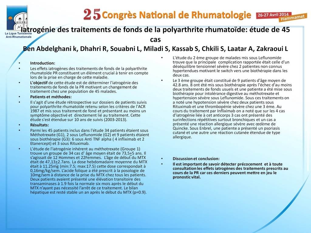 Auteurs: R Alaya, M Jguirim, A Mhenni, L Mani, S Zrour, I Bèjia, M Touzi, N Bergaoui Service de rhumatologie, Hôpital Fattouma Bourguiba - Monsastir