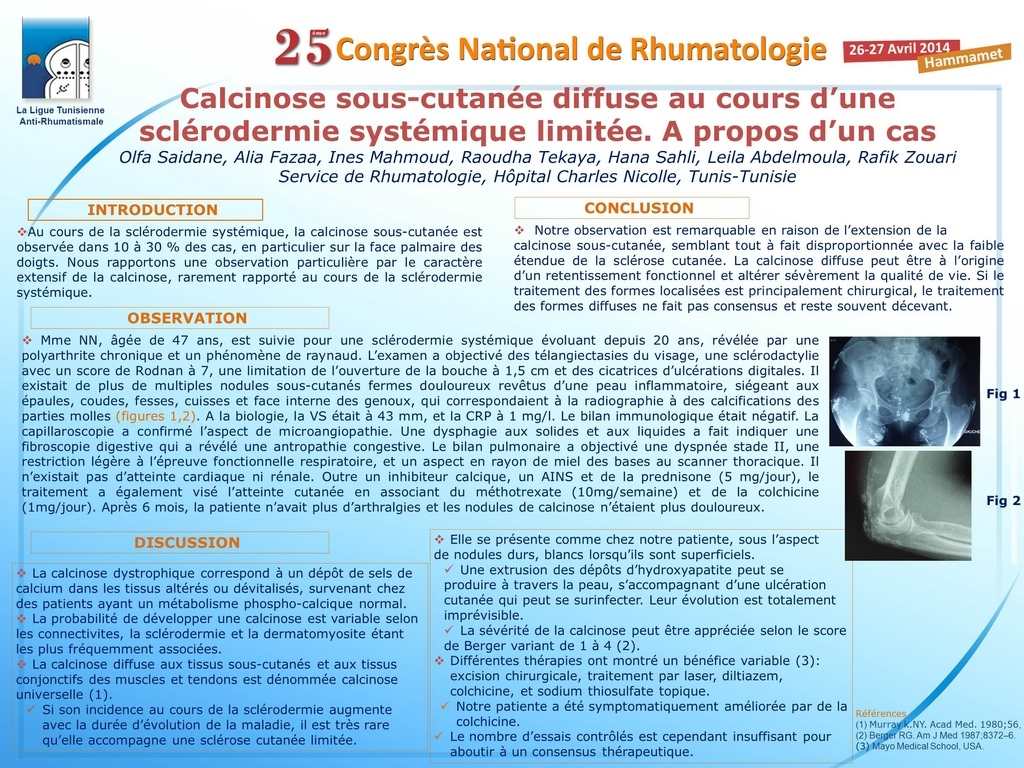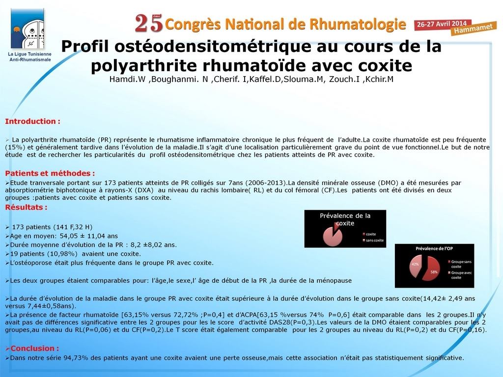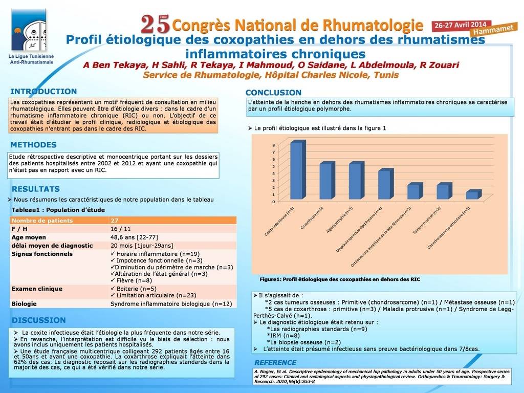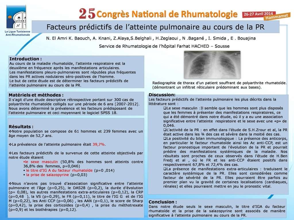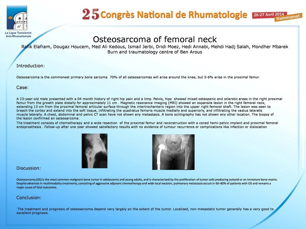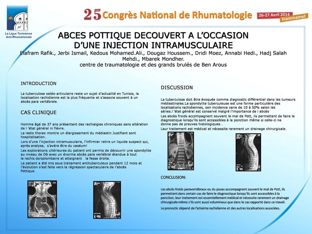 Auteurs: N.El Amri, Z.Alaya, K.Baccouche, *Z.Houneida, H.Zeglaoui, S.Belghali, A.Jamel, N.Amara, I.Ben Smida, N.Bagané, *C.Kraiem, E.Bouajina. Service de Rhumatologie de l’hôpital Farhat HACHED – Sousse *Service de Radiologie de l’hôpital Farhat HACHED – Sousse
