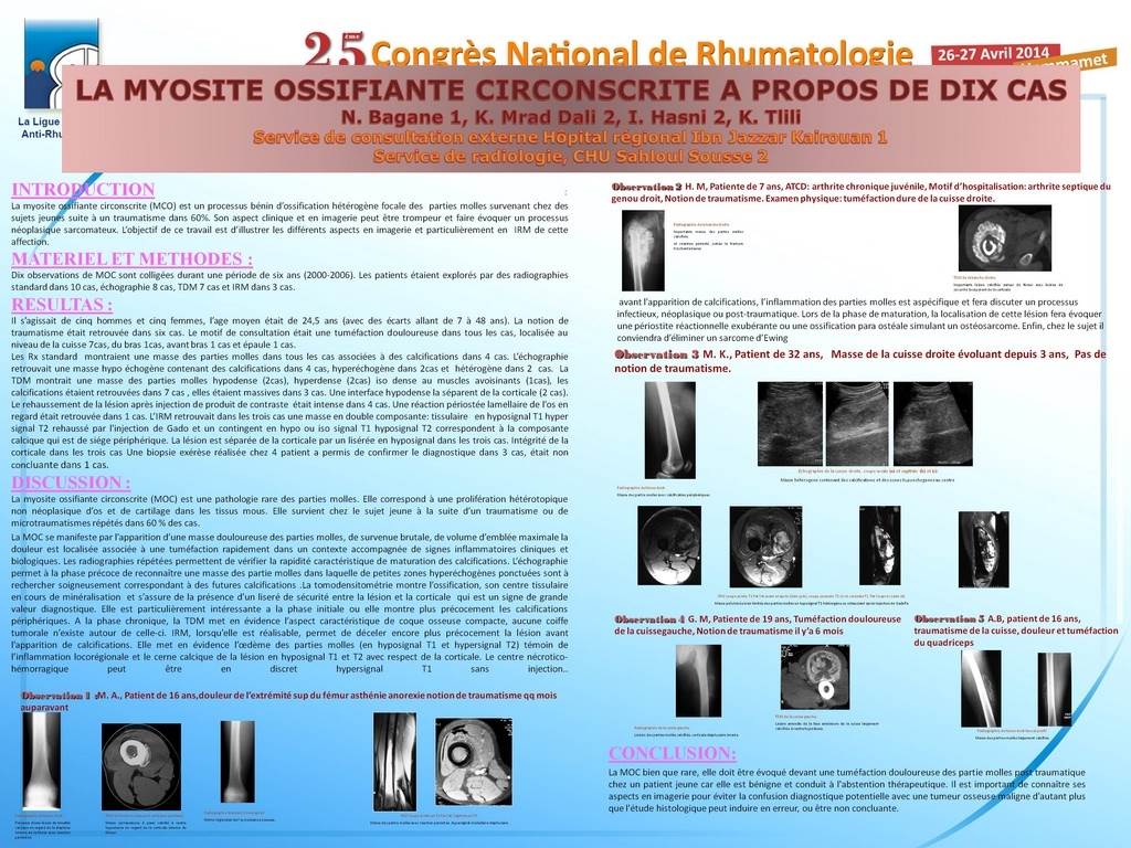 La myosite ossifiante circonscrite (MCO) est une pathologie bénigne des parties molles survenant chez des sujets jeunes suite à un traumatisme dans 60%. Son aspect clinique et en imagerie peut être trompeur et faire évoquer un processus néoplasique sarcomateux. L’objectif de ce travail est d’illustrer les différents aspects en imagerie et particulièrement en IRM de cette affection.